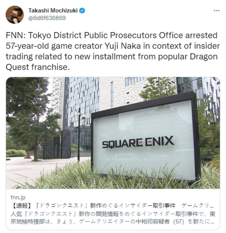 FNN: La Oficina del Fiscal del Distrito de Tokio arrestó al creador de juegos Yuji Naka, de 57 años, en el contexto del uso de información privilegiada relacionado con la nueva entrega de la popular franquicia Dragon Quest.