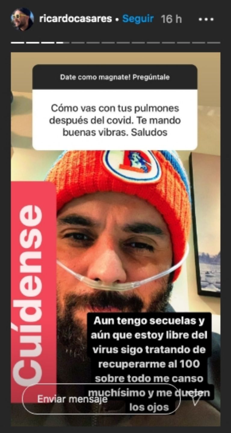 Aún tengo secuelas y aunque estoy libre del virus sigo tratando de recuperarme al 100 sobre todo me canso muchísimo y me duelen los ojos" escribió.