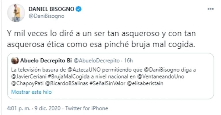 “Frente a los comentarios totalmente asquerosos, xenofóbicos, homofóbicos, perversos, sexosos, que dio ese señor Daniel Bisogno, en la empresa esa...estamos convocando a toda la audiencia de 'Chisme No Like', a todos los colegas, a todos los compañeros, porque llegó el momento de decir ‘stop’. México, tienes que decirle stop a esto que está sucediendo en la televisión", señaló.