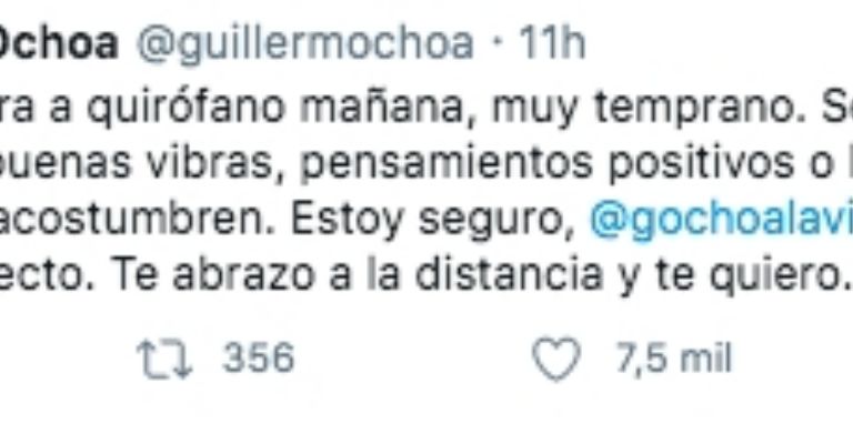 Mi papá entra a quirófano mañana (hoy), muy temprano. Se agradecen oraciones, buenas vibras, pensamientos positivos o lo que ustedes prefieran y acostumbren. Estoy seguro, @gochoalavidava, de que todo resulta perfecto. Te abrazo a la distancia y te quiero", escribió.