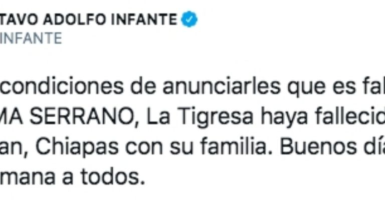 Estoy en condiciones de anunciarles que es falso que doña IRMA SERRANO, La Tigresa haya fallecido", escribió en su cuenta de Twitter.