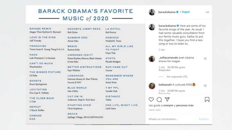En su lista aparecen algunos temas como Ghost de Bruce Springsteen, Goodbye Jimmy Reed de Bob Dylan, Distance de Yebba, entre otras. Obama explicó que por la naturaleza de este año, estuvo obligado a quedarse en su casa, lo que lo llevó a consumir más que nunca series y películas en las plataformas digitales.