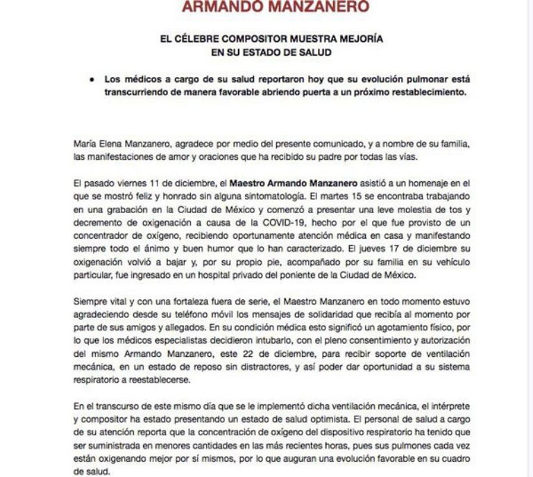 Pero recientemente, la familia Manzanero Canché, dio una actualización sobre el estado de salud del maestro e informó que el pasado martes 22 de diciembre, Armando tuvo que ser intubado con el fin de mejorar su oxigenación,