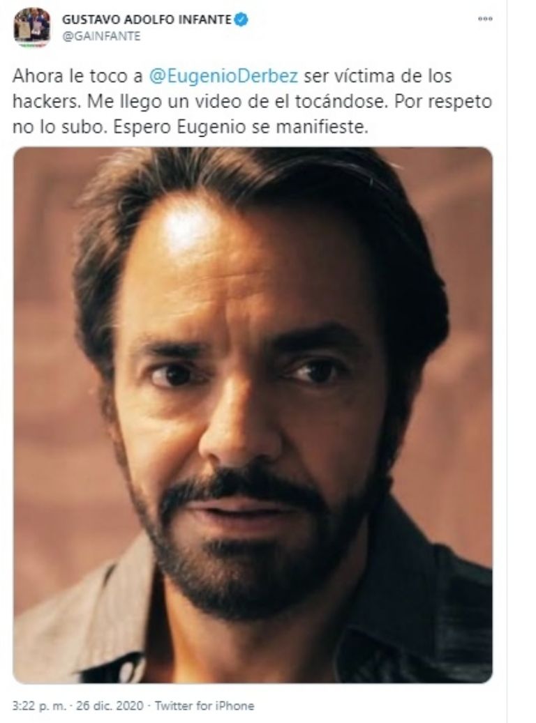 Ahora le tocó a @EugenioDerbez ser víctima de los hackers. Me llego un video de él tocándose. Por respeto no lo subo. Espero Eugenio se manifieste