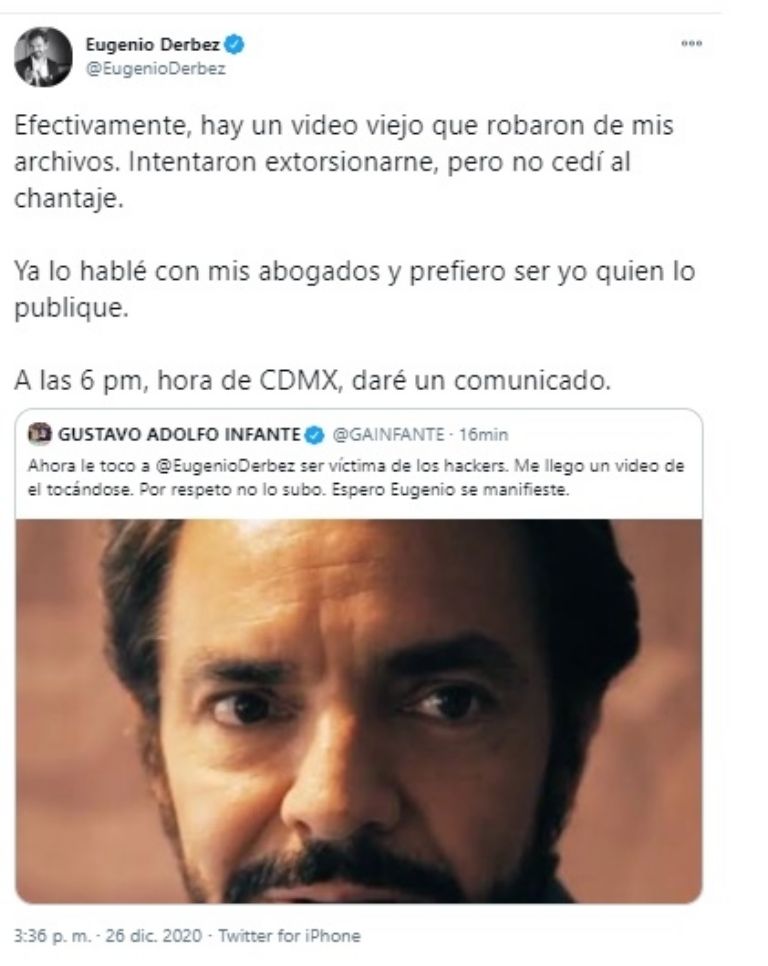 Pero recientemente sorprendió un comunicado a través de Twitter de que había uno nuevo y se trata ahora del comediante Eugenio Derbez. Fue el periodista de espectáculos Gustavo Adolfo Infante, del programa De Primera Mano, que twitteo información de que había recibido un supuesto video íntimo del actor.