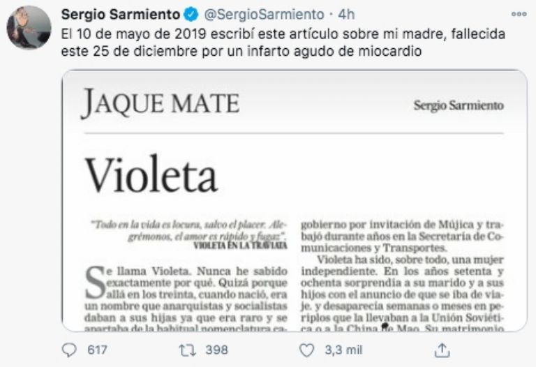 El periodista Sergio Sarmiento reveló en su cuenta de Twitter que su señora madre perdió la vida este 25 de diciembre, víctima de un infartoCiudad de México.- La Navidad fue una fecha difícil para el periodista Sergio Sarmiento que este sábado 25 de diciembre anunció el fallecimiento de su madre, Violeta Fernández de Lara.