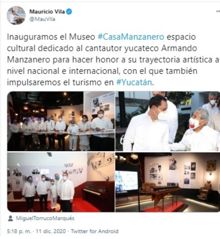 Fue hace unas semanas que el artista fue la inauguración del Museo Casa Manzanero, dedicado homenajear su vida y obra. Al lugar acudieron Mauricio Vila, gobernador de Yucatán, así como el secretario de Turismo federal, Miguel Torruco.