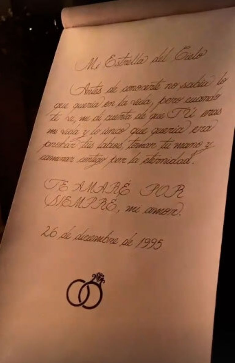 Durante la celebración, Espinoza leyó una carta en donde expresa el amor que siente por la intérprete, la cual dice: