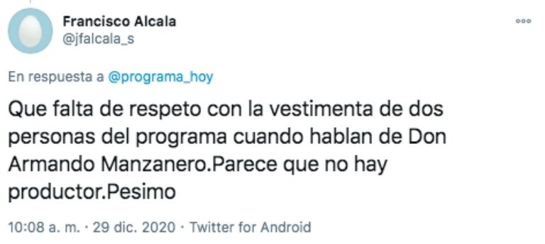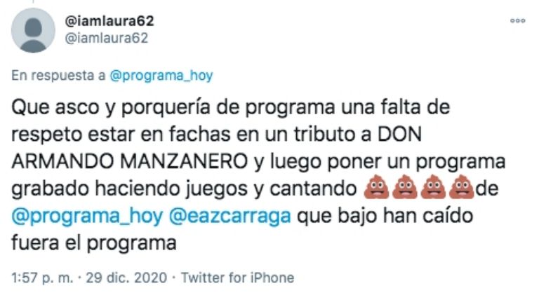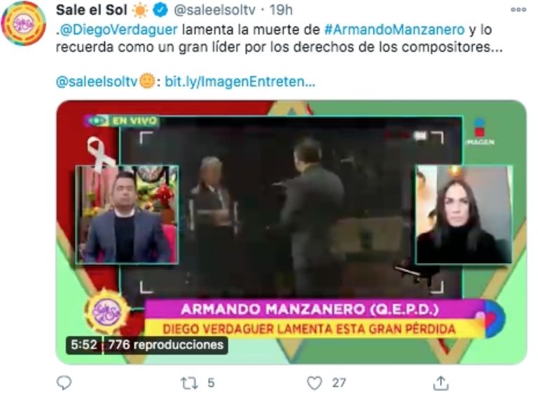 Las emisiones matutinas 'Hoy' y 'Sale el Sol' realizaron este martes un programa especial sobre el fallecimiento de Armando Manzanero generando críticas entre los televidentesCiudad de México.- El pasado lunes 28 de diciembre Venga la Alegría fue el único programa matutino que tuvo una cobertura total sobre fallecimiento de Armando Manzanero generando el reconocimiento de los espectadores.