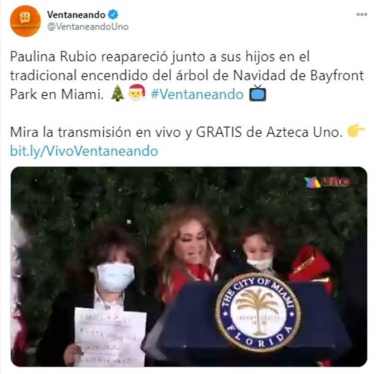 La cantante mexicana Paulina Rubio sorprende al aparecer con sus hijos en el encendido del árbol de Navidad en MiamiCiudad de México. – La cantante Paulina Rubio fue invitada de honor para encender el tradicional árbol de Navidad de Bayfront Park en Miami.