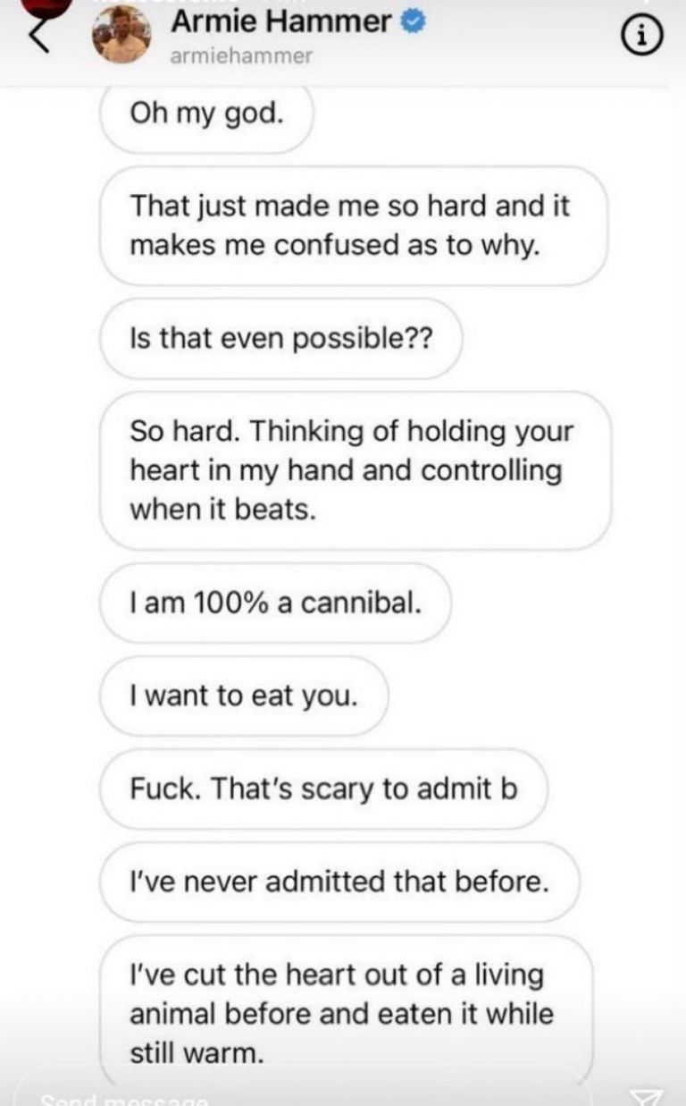 El actor de Hollywood Armie Hammer fue tendencia en Twitter luego de que se difundió una conversación en la que le dijo a una fan que era "caníbal"Estados Unidos.- El popular actor de Hollywood, Armie Hammer, fue tendencia en Twitter debido a que recientemente se difundió en la red social una serie de mensajes que mandó a una de sus fans.