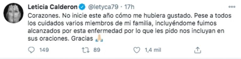 Corazones. No inicie este año cómo me hubiera gustado. Pese a todos los cuidados varios miembros de mi familia, incluyéndome fuimos alcanzados por esta enfermedad por lo que les pido nos incluyan en sus oraciones. Gracias", escribió.