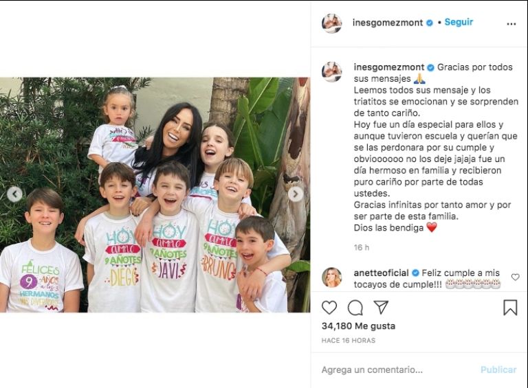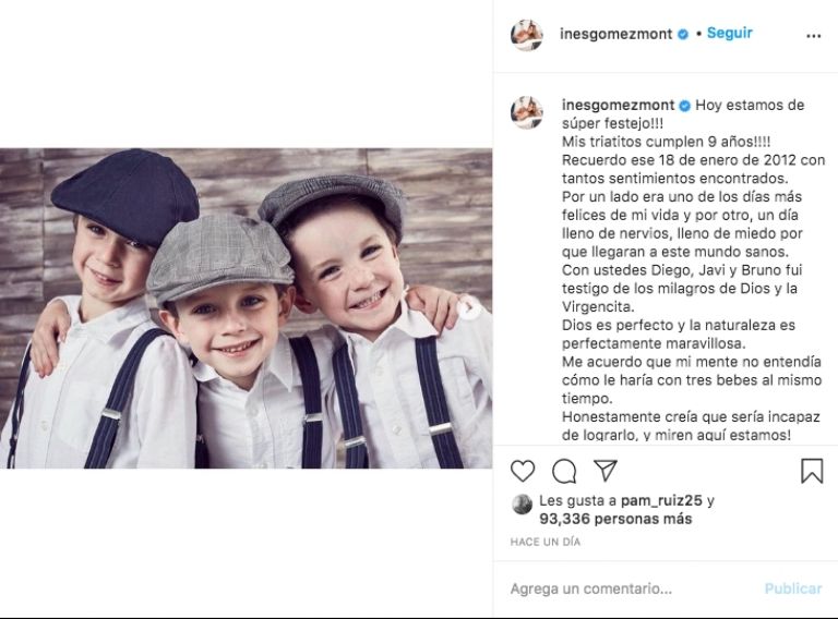 La conductora Ines Gómez Mont compartió con sus seguidores de Instagram el cumpleaños número nueve de sus trillizosCiudad de México.- La exconductora de TV Azteca, Inés Gómez Mont se ha alejado de los medios de comunicación desde hace un tiempo para dedicarse de lleno a sus hijos.