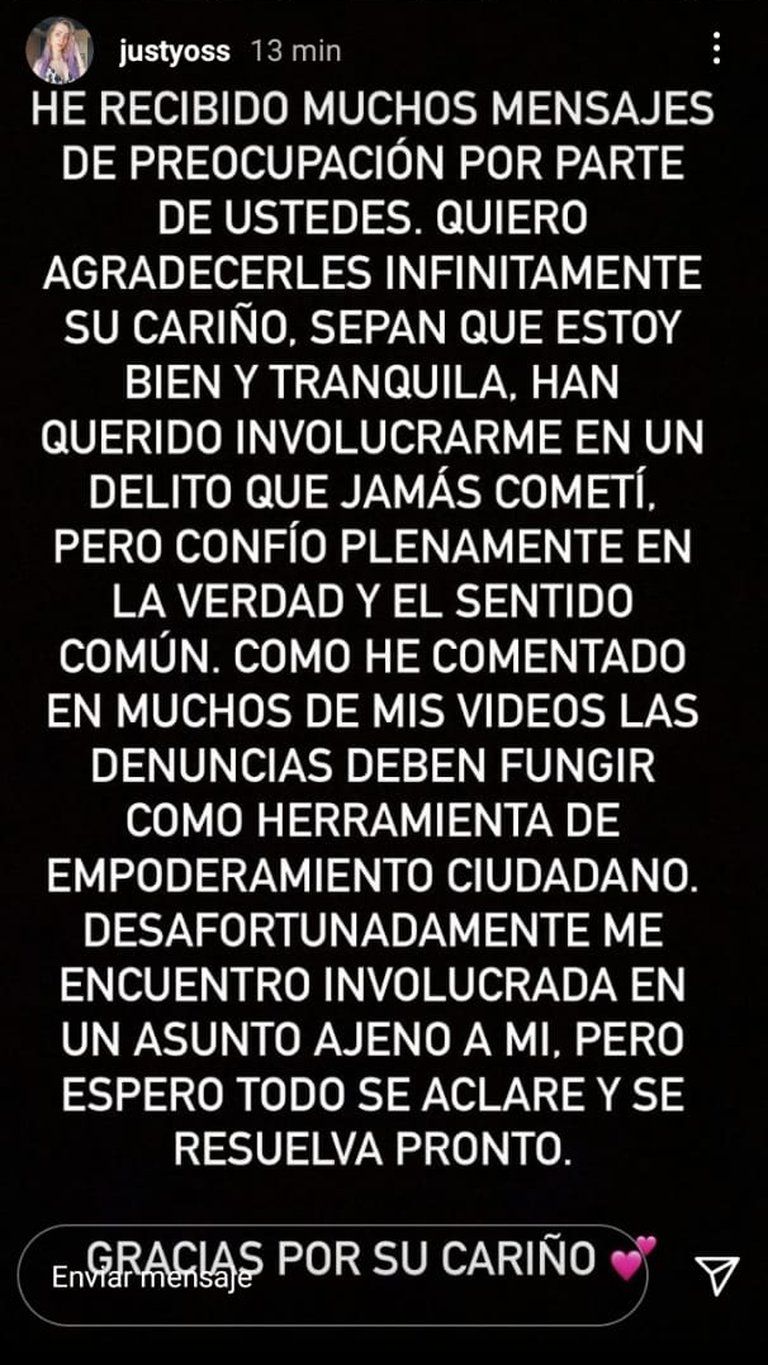 Han querido involucrarme en un delito que jamás cometí. Pero confío plenamente en la verdad y el sentido común. Como he comentado en muchos de mis videos, las denuncias deben fungir como herramienta de empoderamiento ciudadano. Desafortunadamente me encuentro involucrada en un asunto ajeno a mí. Pero espero todo se aclare y se resuelva pronto. Gracias por su cariño, dijo