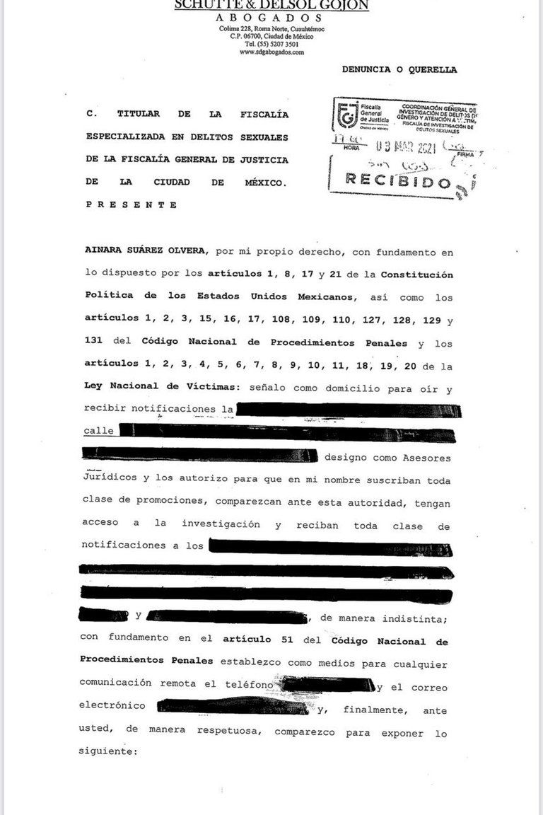 Presentamos denuncia de hechos ante la Fiscalía Especializada en Delitos Sexuales de la Fiscalía General de Justicia de la Ciudad de México por los delitos de Violación Equipara y Pornografía (Infantil), previstos en los artículos 175 y 187 del código Penal aplicable en esta Ciudad (sic), mencionó la denuncia compartida por FemXFem