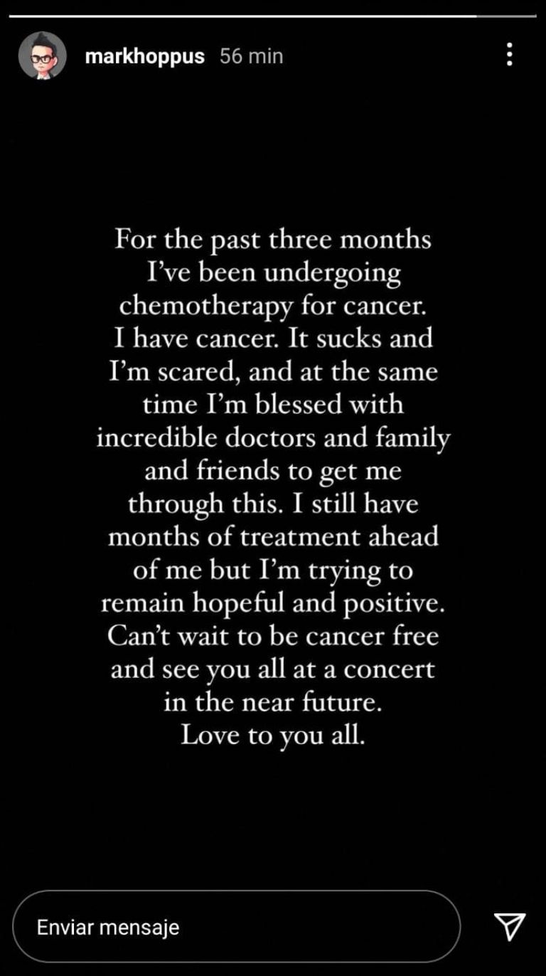 Por medio de su cuenta de Instagram, Mark Allan Hoppus publicó un breve comunicado en el que confesó que padece está terrible enfermedad por lo que se sometido a tratamientos de quimioterapia durante los últimos tres meses.