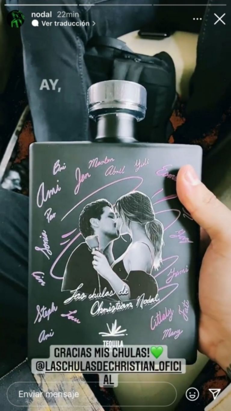 En la foto se puede ver como Nodal tiene una botella de tequila que tiene la foto de Belinda y él besándose, por lo que le agradeció el gesto a "Las chulas de Christian Nodal".
