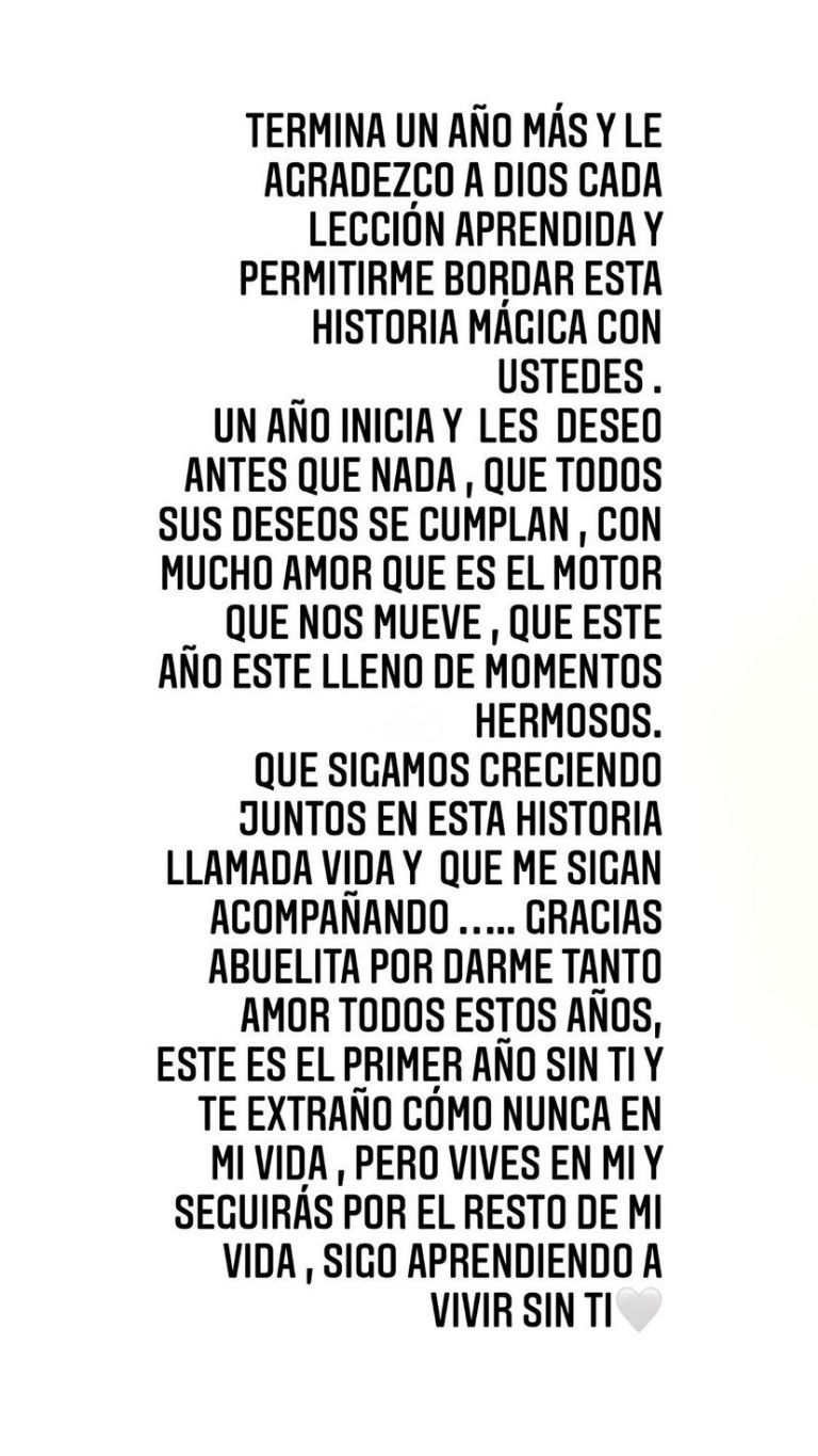 Termina un año más y le agradezco a Dios cada lección aprendida y permitirme bordar esta historia mágica con ustedes. Un año inicia y les deseo antes que nada, que todos sus deseos se cumplan, con mucho amor que es el motor que nos mueve, que este año esté lleno de momentos hermosos. Que sigamos creciendo juntos en esta historia llamada vida y que me sigan acompañado…. Gracias abuelita por darme tanto amor todos estos años este es el primer año sin ti y te extraño como nunca en mi vida, pero vives en mí y seguirás por el resto de mi vida, sigo aprendiendo a vivir sin ti”.
