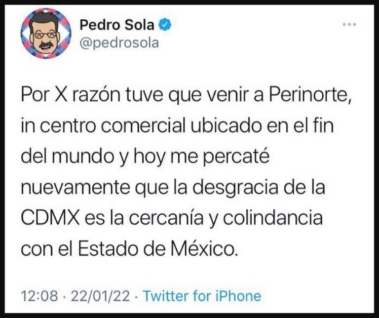 Por medio de sus redes sociales, arremeten contra Pedro Sola por comentario sobre el Edo de México y lo tachan de clasistaCiudad de México.- Pedro Sola, quien es conductor de Ventaneando, entró en una nueva polémica, por la cual fue tachado de clasista, luego de haber tuiteado contra el Estado de México.
