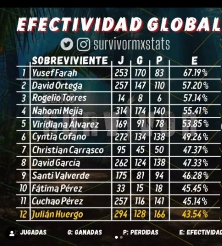 El público le dio el gane a Julián Huergo, pero de acuerdo a la tabla de efectividad global con su porcentaje ni siquiera alcanzaba a estar como finalistaCiudad de México.- La tercera temporada de Survivor México llegó a su fin con el campeonato de Julián Huergo, quien gracias a sus habilidades y estrategias consiguió su objetivo, embolsándose la para nada despreciable cantidad de 2 millones de pesos más los dólares que ganó en las pruebas individuales por la recompensa, pero aunque es el ganador indiscutible las estadísticas globales no lo favorecen, es decir que si la competencia se hubiera basado únicamente en los juegos no habría llegado ni como finalista.