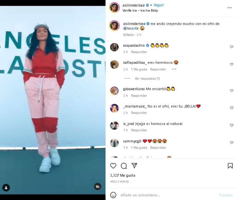 Un outfit que presumió para promover su nueva colaboración de ropa deportia, donde presumió su figura con un destacado conjunto rosa con rojo y uno tenis blancos: "me ando creyendo mucho con mi ofni de @lacoste ??", se lee en el post.