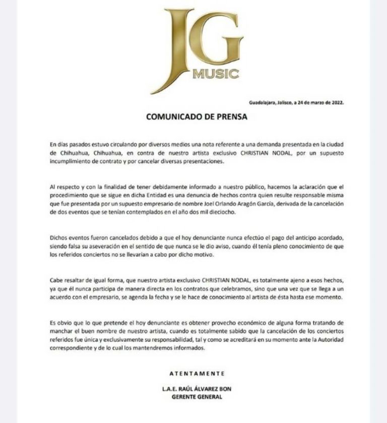 Joel Aragón García fue quien levantó la demanda por incumplimiento de contrato, además dijo que esto es para quien sea responsable. En el comunicado que lanzó la oficina de Nodal se señala que esto solo es para obtener un beneficio monetario y manchar el nombre del cantante.