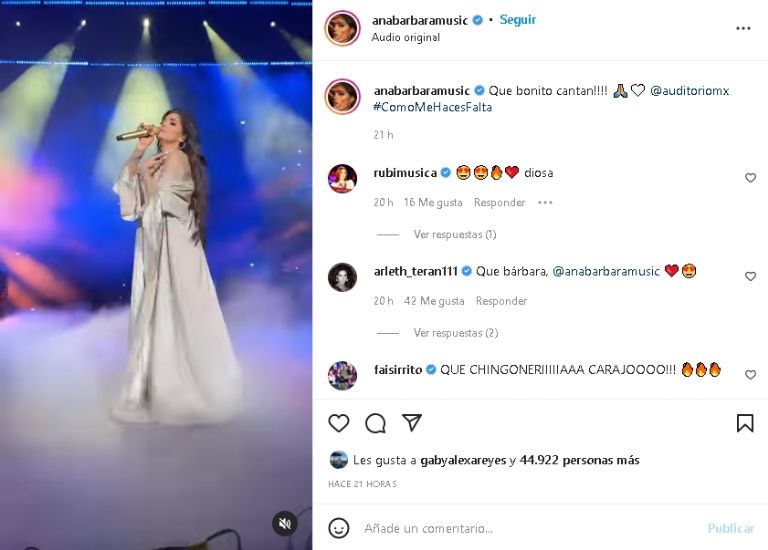 Dicha publicación de Ana Bárbara recibió más de 44 mil 'Me Gusta' en solo unas horas; incluso recibió muchos piropos y halagos por parte de sus miles de fanáticos del país.