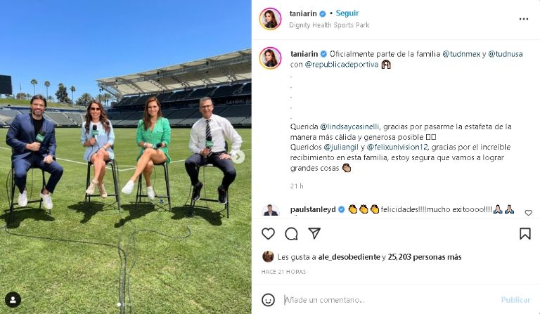 Oficialmente parte de la familia @tudnmex y @tudnusa con @republicadeportiva. Querida @lindsaycasinelli, gracias por pasarme la estafeta de la manera más cálida y generosa posible ????. Queridos @juliangil y @felixunivision12, gracias por el increíble recibimiento en esta familia, estoy segura que vamos a lograr grandes cosas", escribió en su post.