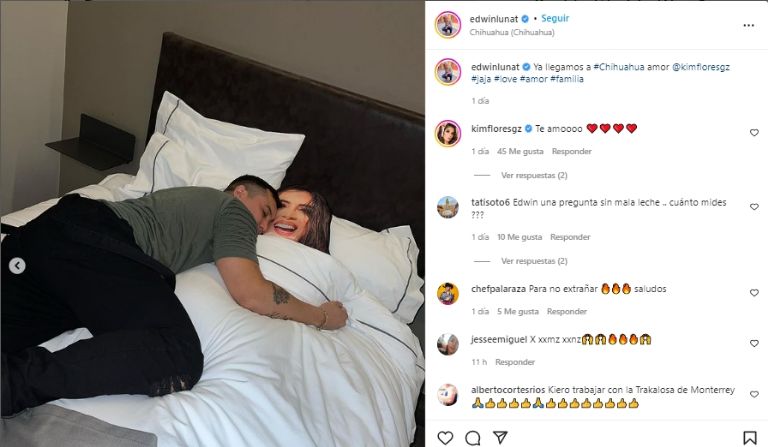 El vocalista recibió con gusto el detalle y posteo algunas fotografías en las que se le ve recostado abrazando su almohada como si la misma Kim estuviera a su lado, mientras que en otra besa la imagen de su esposa y disfruta de su manta para no pasar frío, reportándose que había llegado a Chihuahua con el amor de Kimberly Flores.