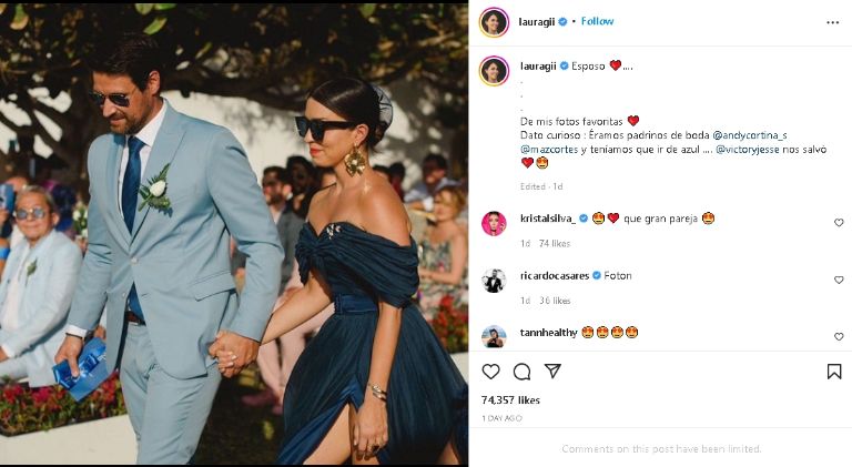 Sin embargo, su vida lejos de los foros de grabación también va de maravilla, pues Laura G ha tenido la fortuna de convertirse en mamá en dos ocasiones, producto de su matrimonio con Nazareno Perez Brancatto. Y esta vez decidió presumirlo en sus redes sociales con una encantadora fotografía, donde aparecen muy románticos desde un exclusivo evento privado de sus seres cercanos y que ha causado toda una sensación en Internet.