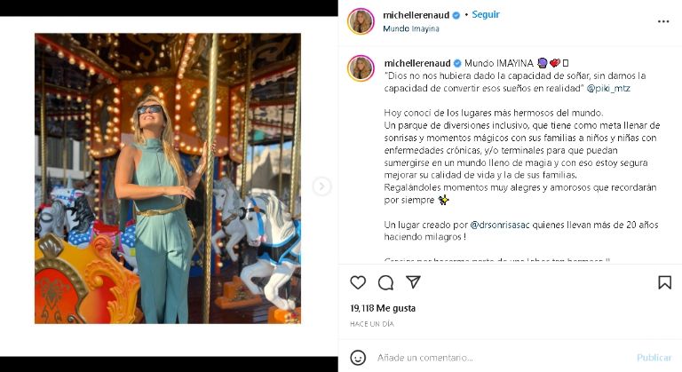 Hoy conocí de los lugares más hermosos del mundo. Un parque de diversiones inclusivo, que tiene como meta llenar de sonrisas y momentos mágicos con sus familias a niños y niñas con enfermedades crónicas, y/o terminales para que puedan sumergirse en un mundo lleno de magia y con eso estoy segura mejorar su calidad de vida y la de sus familias. Regalándoles momentos muy alegres y amorosos que recordarán por siempre", se lee en el post.