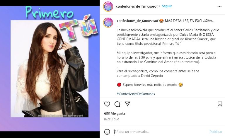 "La nueva telenovela que producirá el señor Carlos Bardasano y que posiblemente estaría protagonizada por Dulce María (no está confirmada), será una historia original de Ximena Suárez, que tiene como título provisional 'Primero Tú", se informó a través de redes.