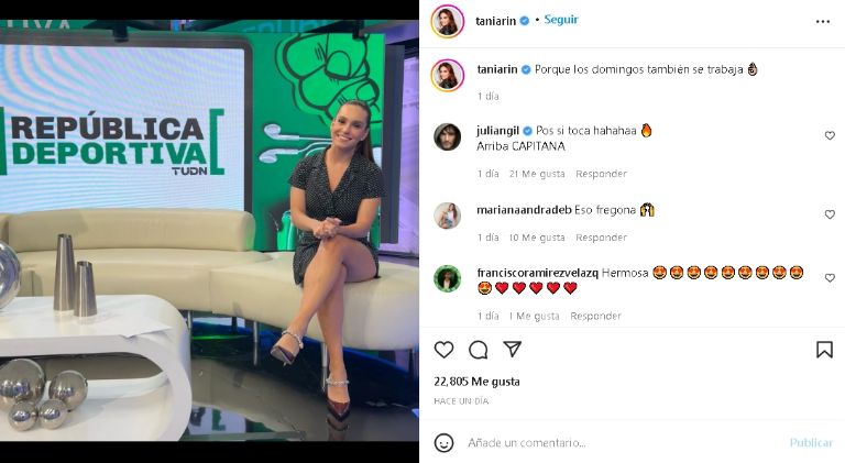 Resulta que la gran compañera de Andrea Legarreta, Galilea Montijo y Andy Escalona utilizó su cuenta oficial de Instagram para compartir una impactante fotografía de su nuevo trabajo, este de trata de su gran papel como presentadora para el programa 'República Deportiva' de TUDN, donde desempeñará un labor como analista de deportes junto a Julián Gil y Felix Fernánd. Una imagen que dejó impactados a sus 3.8 millones de seguidores de Internet.