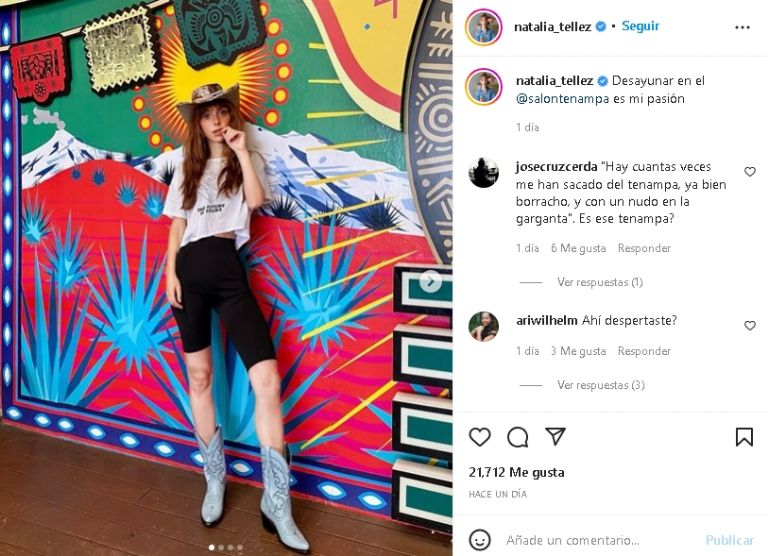 Una imagen que causó toda una sensación este tarde 15 de julio, pues también destacó el gran mural colorido donde posó Téllez, mismo que pertenece a un destacado restaurante de la CDMX al cual fue a comer este viernes: "Desayunar en el @salontenampa es mi pasión".