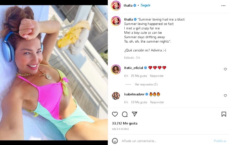 En otras imágenes de la misma publicación también se visualiza a la intérprete de temas como 'No me acuerdo', 'Marimar', 'Desde esa noche', '¿A quién le importa?', 'Qué será de ti' y 'Equivocada' gozar de una cálida tarde de verano desde una alberca, donde también mostró su increíble look de día conformado por un traje de baño rosa con verde que resaltó su gran porte frente a la cámara.