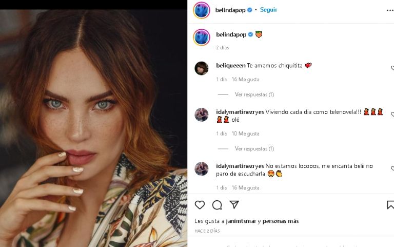 El espectacular post de Belinda robó corazones entre sus miles de admiradores, quienes no se limitaron y enviaron diversos mensajes llenos de elogios y piropos sobre su envidiable belleza, entre los más populares destacan los siguientes: comentarios llenos e carillo y piropos. de los cuales siempre han resaltado los siguientes: "Amo ese look", "Brillante", "Vive cada día como telenovela", entre otros.