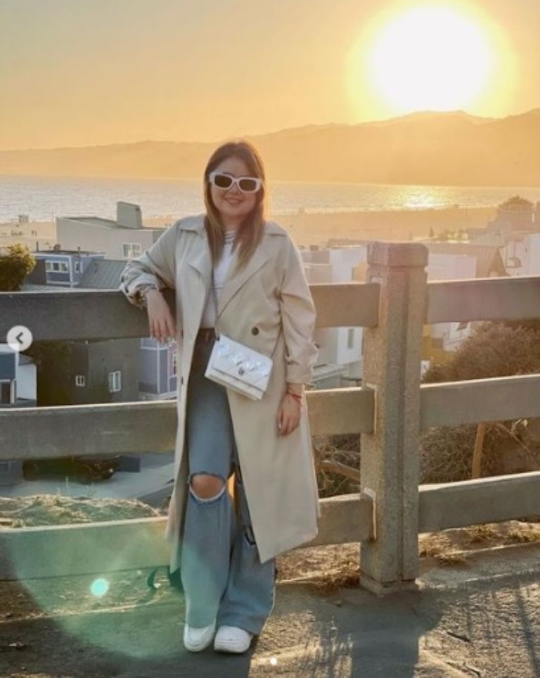 La actriz está siempre en tendencia y porta unos mom jeans acampanados, los cuales le dan un toque muy urbano, los acompañó con unos tenis básicos en color blanco al igual que su crop top, para cubrirse utilizó una gabardina larga en tono arena para dar un poco de contraste y para resaltar su outfit decidió colocar algunos accesorios en color plata, unos lentes cuadrados y un bolso blanco.