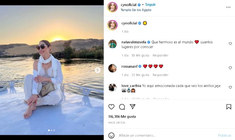 Este se trato en un distinguido conjunto blanco que resaltó el envidiable cuerpo que tanto la ha caracterizado; una combinación que enalteció su gran belleza mientras posa en el distinguido templo de Isis, lugar al que visitó tras dejar los foros del Ajusco el pasado mes de mayo para contraer matrimonio con su actual pareja, Carlos Rivera.