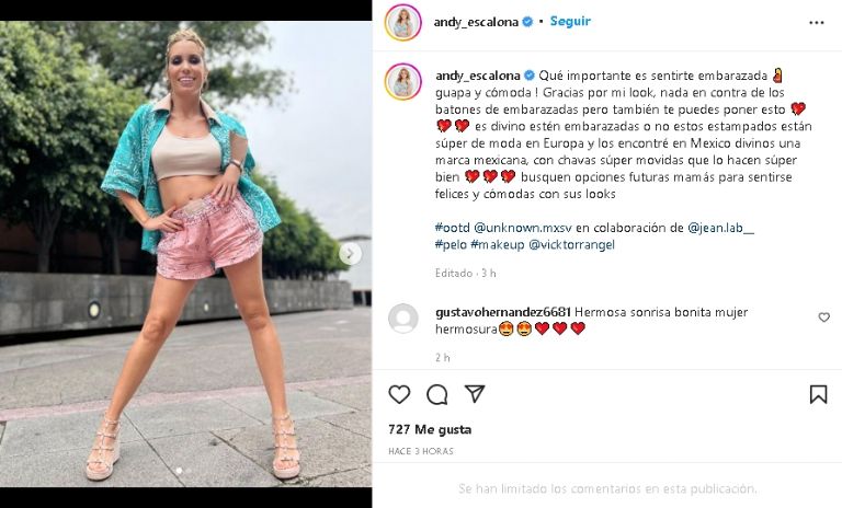 Este consistió en un distinguido top caf, una blusa azul y un short rosa que enalteció su aclamada figura y gran belleza durante su viaje al otro lado del mundo. Incluso aprovechó para mostrar su emoción de convertirse en madre: "Qué importante es sentirte embarazada, guapa y cómoda. Gracias por mi look, nada en contra de los batones de embarazadas pero también te puedes poner esto".