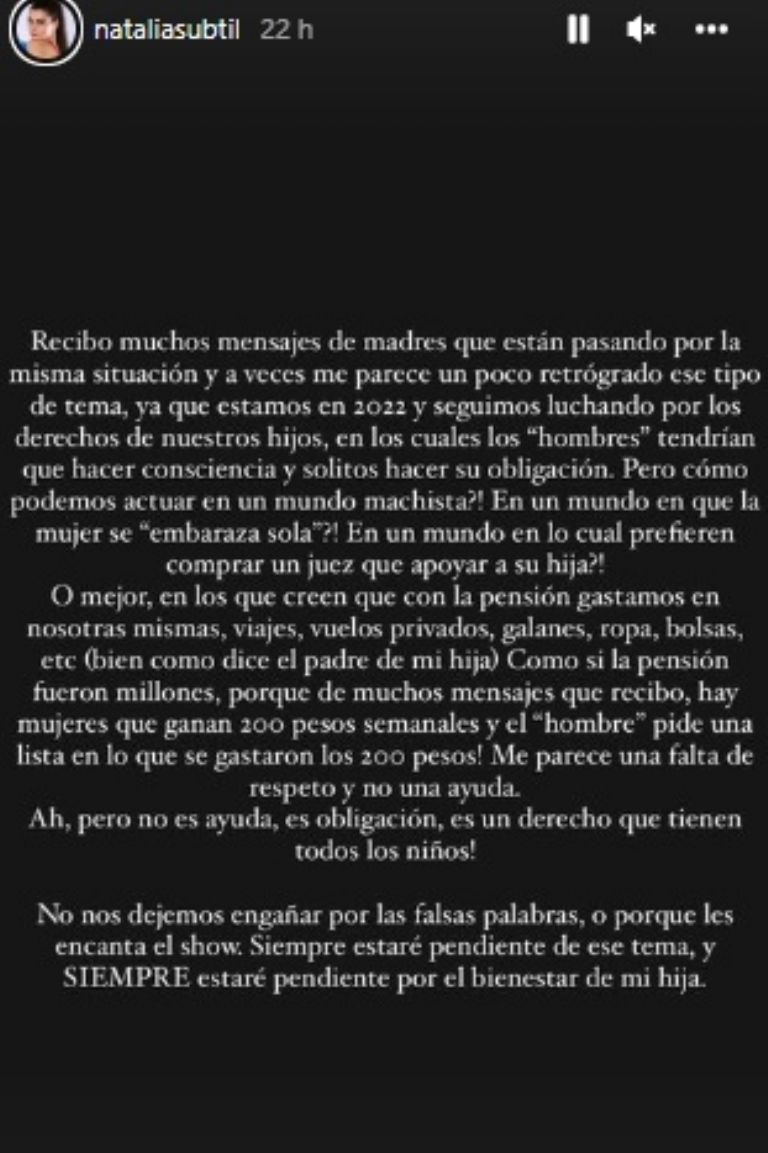 Finalmente, Natalia Subtil posteó algunos mensajes en aras de hacer conciencia que en pleno 2022 muchas madres atraviesan la misma situación que ella tratando de luchar por los derechos de sus hijos, cunado los padres deberían hacer solos conciencia y cumplir con sus obligaciones sin ningún tipo de justificación.