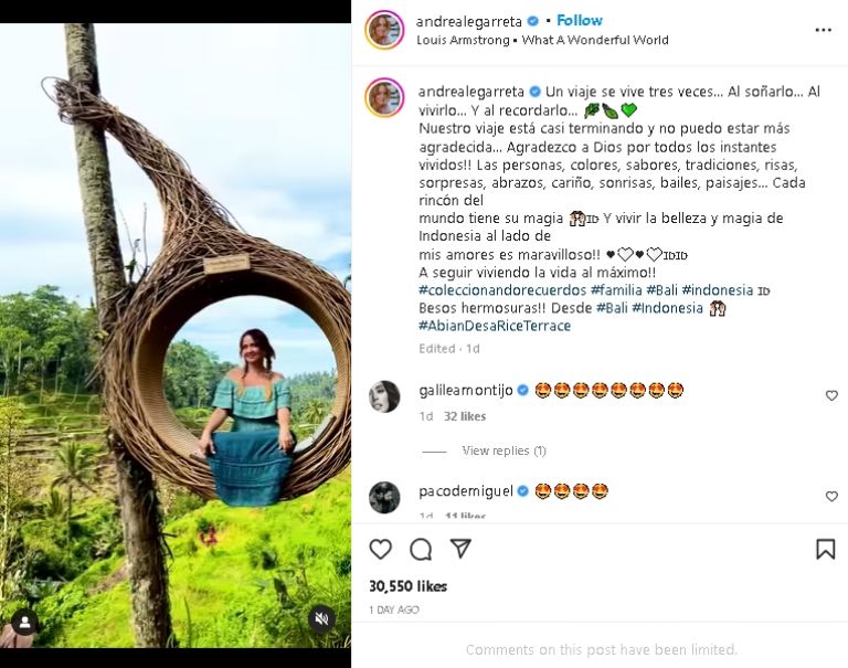 Un viaje se vive tres veces… Al soñarlo… Al vivirlo… Y al recordarlo. Nuestro viaje está casi terminando y no puedo estar más agradecida… Agradezco a Dios por todos los instantes vividos!! Las personas, colores, sabores, tradiciones, risas, sorpresas, abrazos, cariño, sonrisas, bailes, paisajes… Cada rincón del mundo tiene su magia Y vivir la belleza y magia de Indonesia al lado de mis amores", se lee en el post