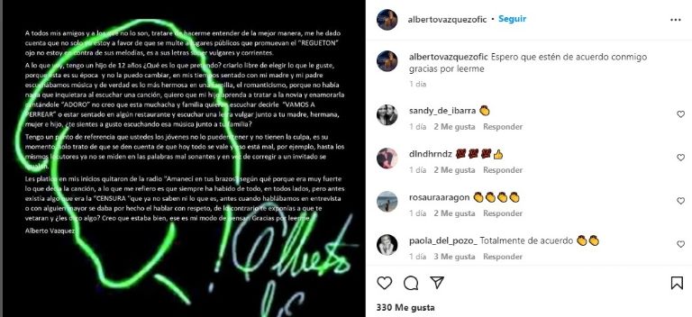 Desde su cuenta de Instagram, el cantante de 82 años, recalcó que no está en contra el género musical, sino de sus letras "vulgares" y "corrientes", así mismo procedió a realizar una comparación con su época en donde el romanticismo predominaba, mientras que ahora no hay límites ni en la música ni en los medios y eso es lo que lo lleva a pensar que no se debería escuchar reguetón en lugares públicos.