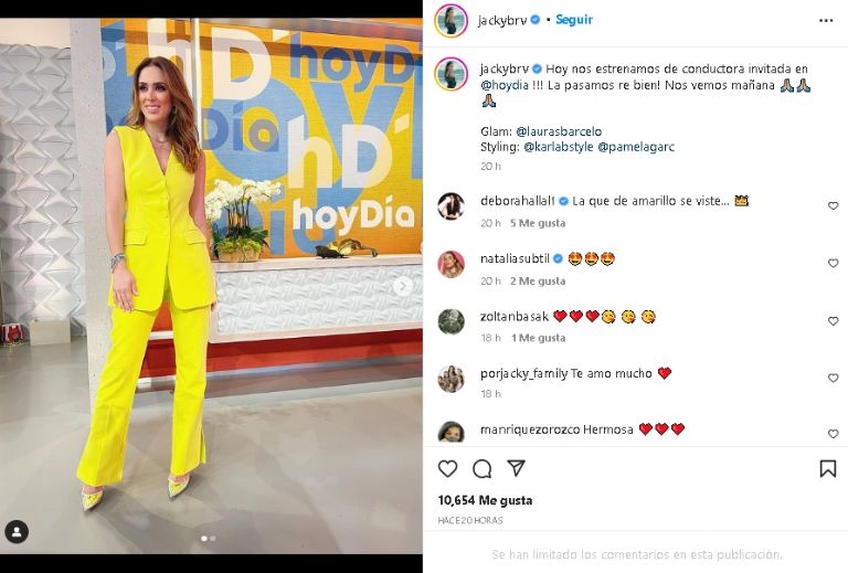 La intérprete de telenovelas y exetrella de Televisa publicó una imagen en luce un distinguido conjunto de color amarilla que la hizo brillar en Internet. Un outfit que presumió en toda la red y que causó un gran impacto entres sus admiradores; pues no solo impactó su buen gusto por las prendas, mismo que utilizó en el programa 'Hoy Día'.