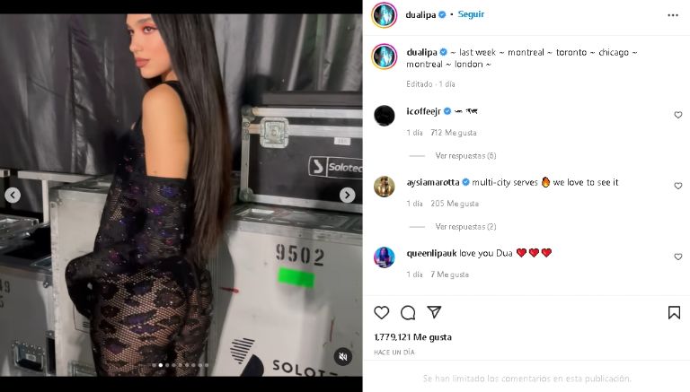 La famosa cantante de pop regresó a las redes y lució un encantador jumsuit negro con transparencia en su cuenta de InstagramEstados Unidos.-La destacada cantante de pop, Dua Lipa, deleitó las redes sociales al posar con un coqueto outfit claro que le queda a la perfección. Un atuendo que no dudo en compartir vía Instagram con unas impactantes fotografías de su distinguida apariencia física que dejaron en shock a todos sus fieles seguidores de Internet.