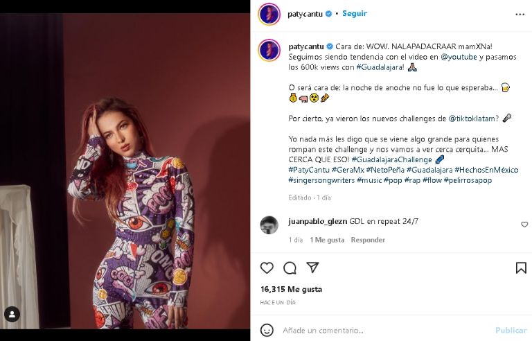 Una prenda que utilizó en su reciente presentación en Guadalajara, donde agradeció al público por asistir a su espectáculo: "O será cara de: la noche de anoche no fue lo que esperaba. Yo nada más les digo que se viene algo grande para quienes rompan este challenge y nos vamos a ver cerca cerquita", escribió.
