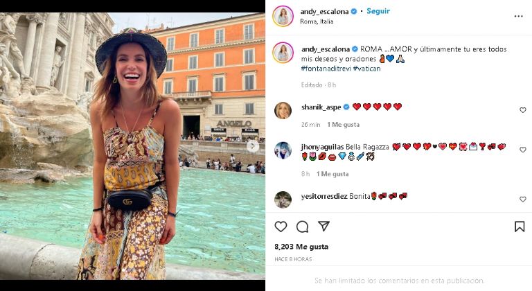 Este consistió en un distinguido vestido largo de color amarillo que enalteció su aclamada figura y gran belleza durante su viaje al otro lado del mundo. Incluso aprovechó para mostrar su emoción del viaje: "ROMA …AMOR y últimamente tu eres todos mis deseos y oraciones".