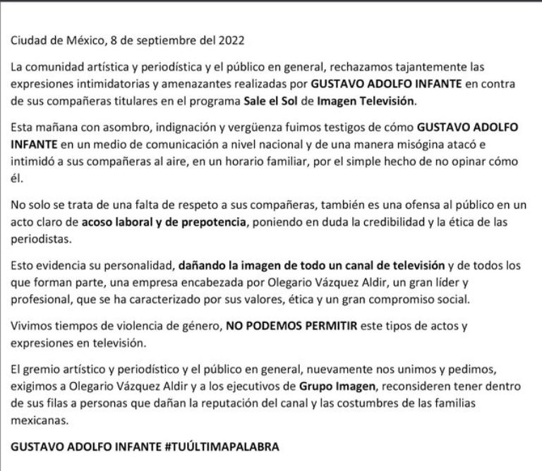 En su comunicado, Sergio Mayer menciona que la comunicad artística y el público rechazaban las amenazas de Gustavo Adolfo Infante en contra de sus compañeras Joanna Vega-Biestro y Ana María Alvarado.