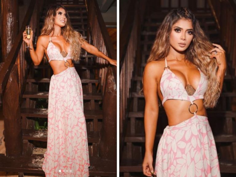 En la imagen que publicó se le puede ver posando al pie de una escalera con copa en mano, el atuendo es ideal para un evento en la playa o temporada primavera - verano por la tela vaporosa y el estampado floreado, el vestido tiene un profundo escote en el pecho y la espalda al descubierto, el abdomen también se luce, por lo que solo las más atrevidas y que poseen una figura de diosa como Kimberly Flores se animan a utilizar estos diseños.