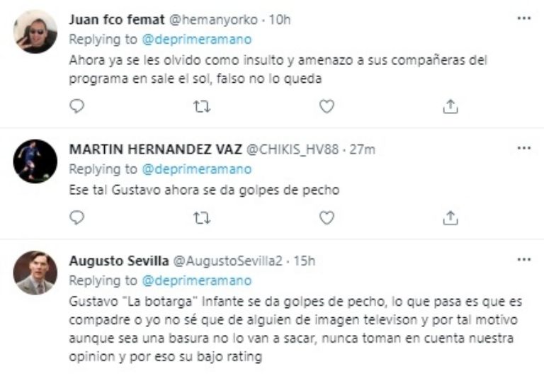 Recordemos que Infante amenazó a sus compañeras con renunciar porque no las soporta y puso a elegir a la televisora entre ellas o él, situación que fue muy criticada y aunque muchos televidentes y famosos han mostrado sus deseos de que lo quiten de su puesto, Gustavo Adolfo Infante sigue como estelar, así que no lo perdonan y le recuerdan que el reacciona igual que su archienemigo Alfredo Adame.