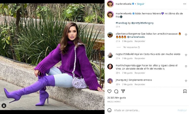 La aclamada estrella de la televisión regresa a las redes sociales y posa con un encantador outfit morado en InstagramCiudad de México. La destacada actriz de televisión Marlene Favela no se limitó y derrochó belleza en las redes sociales, luego de posar con un encantador look café , ideal para la primavera que iniciará en marzo. Un coqueta combinación que enalteció su gran belleza al dejarse ver de lo más espectacular frente a las cámaras del espectáculo.